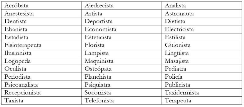 Ante esta situación, para ver si el lenguaje actual era no inclusivo o predominantemente machista, era necesaria una investigación mayor sobre las palabras que utilizamos, y por qué a veces encontramos una distinción de lo masculino y lo femenino, y en otros casos no aparece tal distinción. Un ejemplo: para la profesión de arquitecto encontramos el término: “arquitecta”, pero para la profesión de psiquiatra no encontramos el término: “psiquiatro”. ¿Significa eso que hay unas profesiones que son sexistas, y otras que no? Evidentemente eso no es así. Lo que podemos ver es que hay un término genérico para referirse a cada una de las distintas profesiones, y que ese término genérico a veces finaliza en “o” (atribuido generalmente al masculino) y a veces finaliza en “a” (atribuido generalmente al femenino). También encontramos casos en que la terminación es una “e” o una consonante. No son pocas las profesiones desempeñadas tanto por hombres como por mujeres en las que la palabra utilizada para definirla finaliza con “a” (supuestamente femenino). Como ejemplo, puede ver a continuación una relación de profesiones, oficios, ocupaciones y cargos diversos, que al finalizar con la letra “a” serían, a priori, términos femeninos: